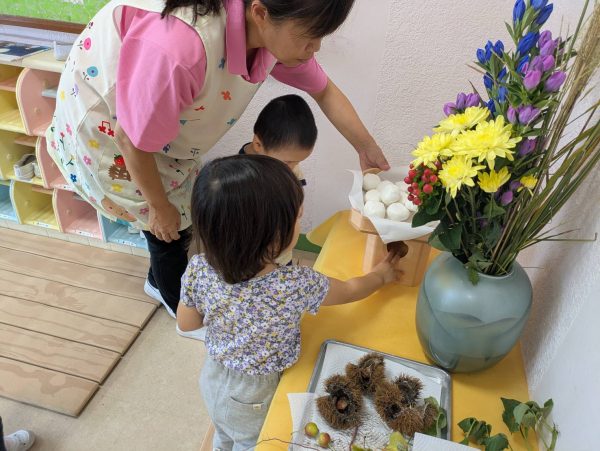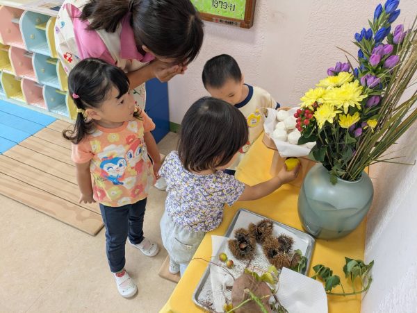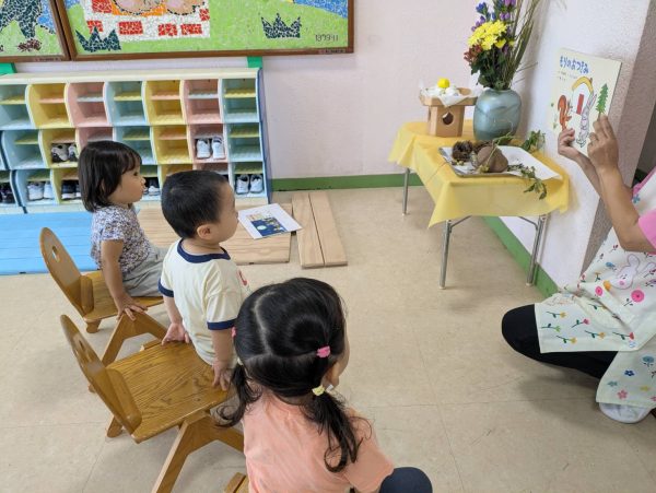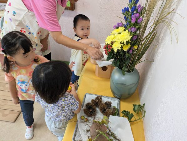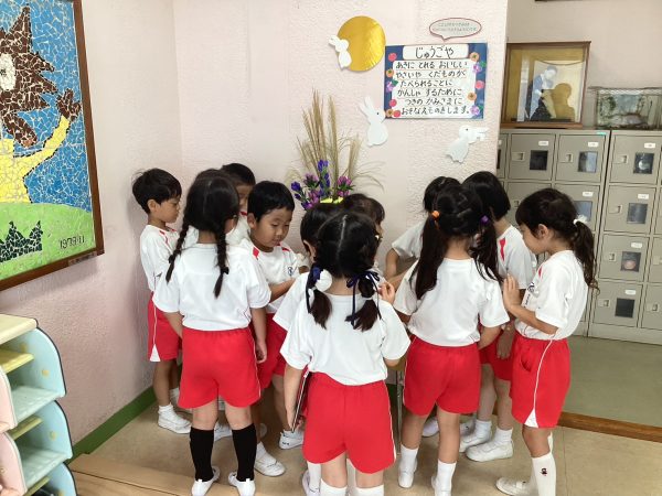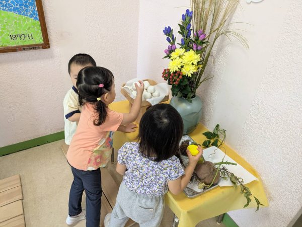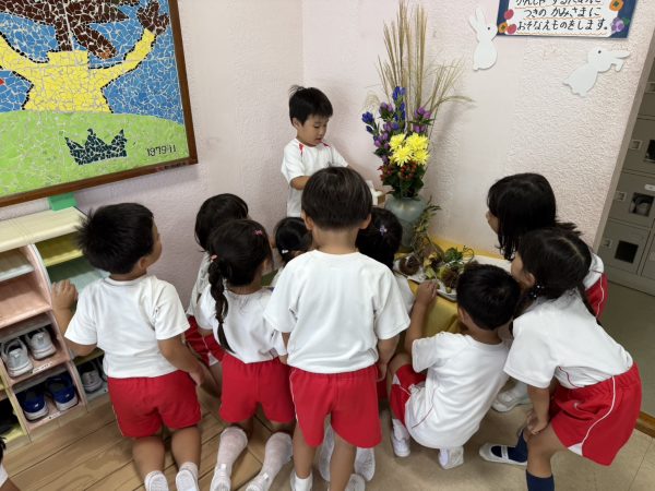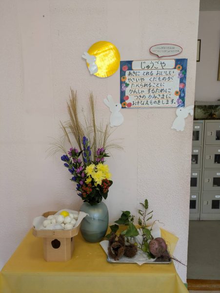 お月様にお供えをするお芋やお団子・ススキやお花を見ながら先生たちから十五夜の由来のお話を聞きました。