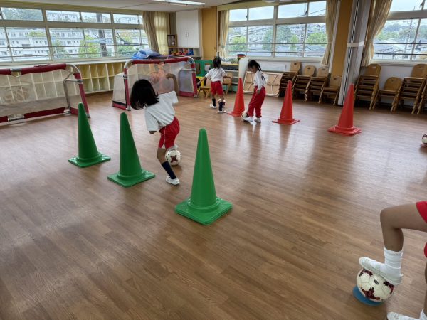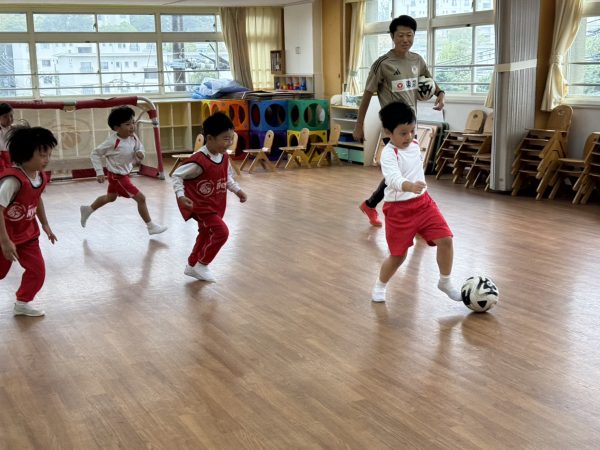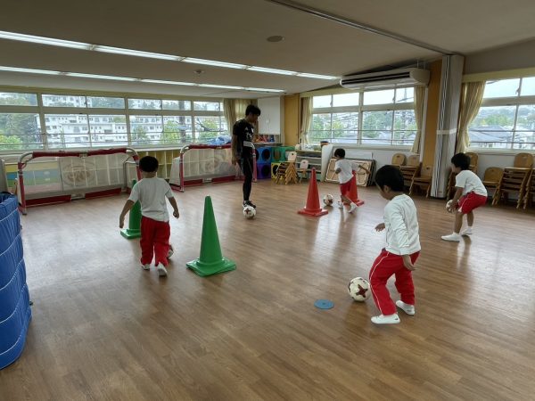 今日は雨だったので幼稚園の遊戯室でサッカーを行いました。