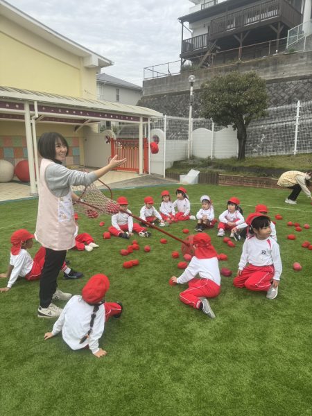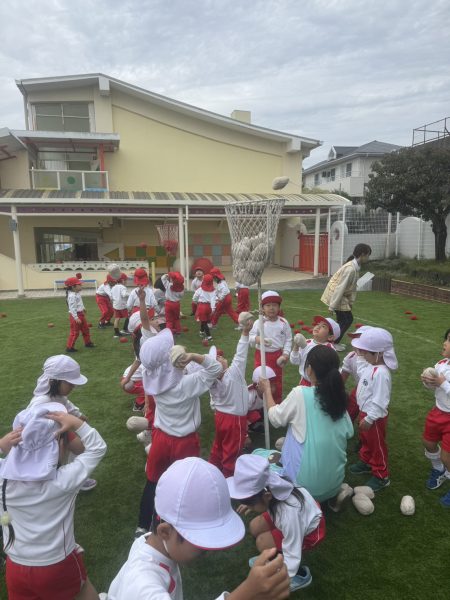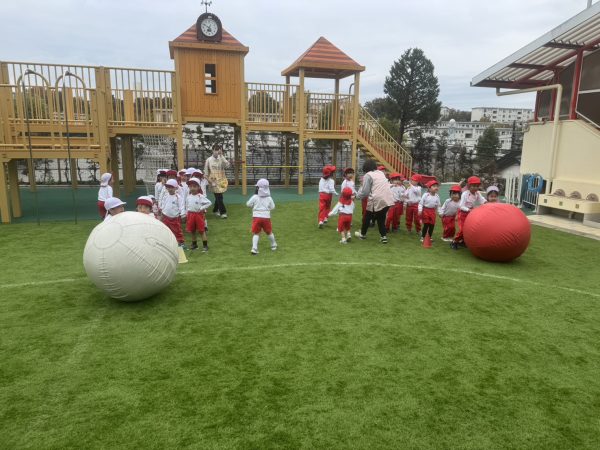 年少組と年中組で玉入れ、大玉ころがし、ラララ体操を楽しみました。