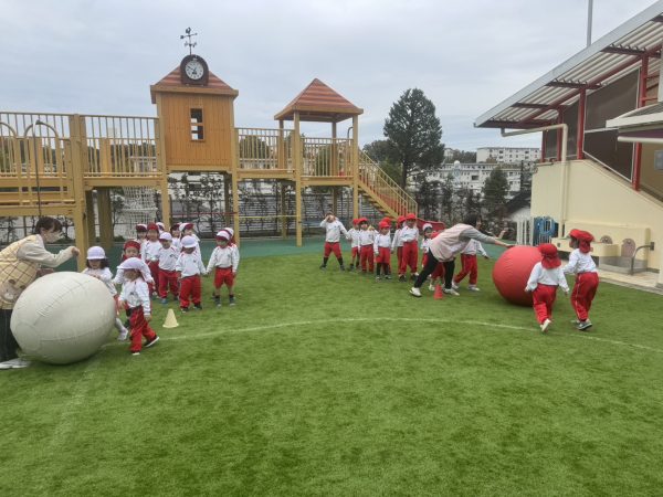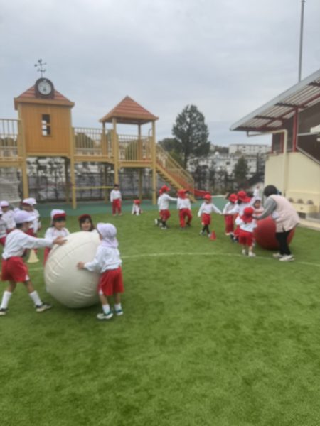 年中組さんが年少組さんを誘ってくれてペアを作り、一緒に大玉をころがすことを楽しんでいました。