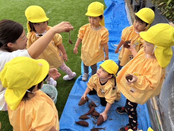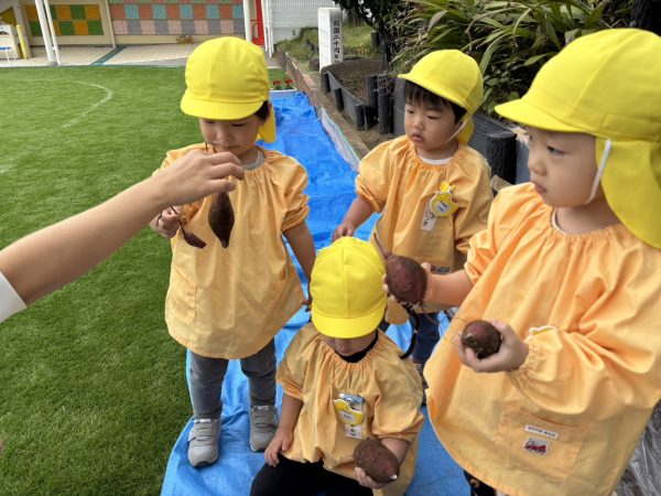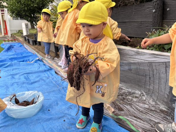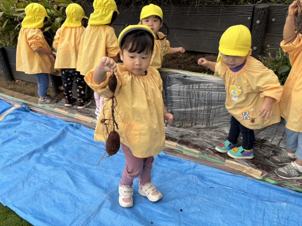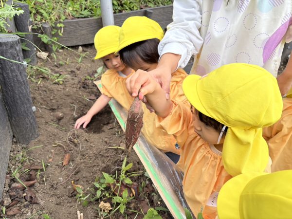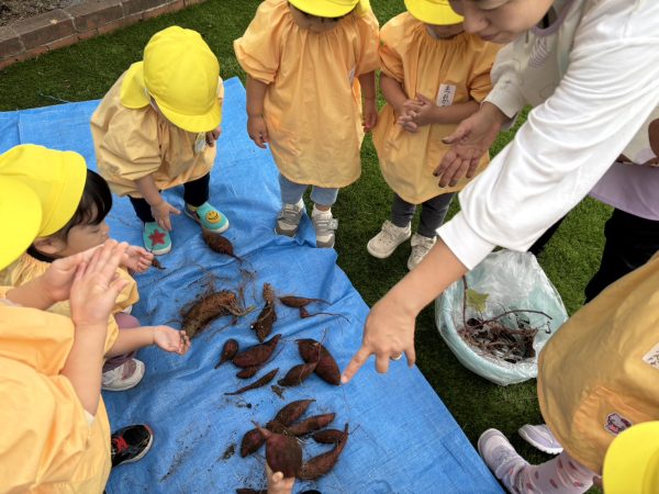 「ここにもみつけた!」と次々に宝探しのようにさつまいもを見つけ、「まるいね」「あかちゃんいも」などと色々な形を見て言葉にする姿がありました。
