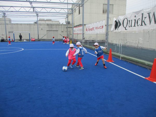試合をするなかでも、相手チームがそばにいるときには避けてからシュートすると良いことなどを教えていただき、子どもたちもコーチの真似をしながら頑張っていました。
