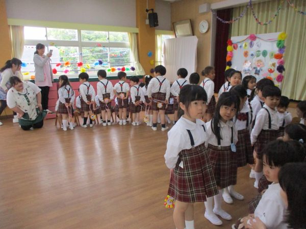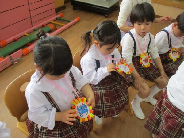 最初は何が始まるのかドキドキしていた年少組さんでしたが、年中さんからの手遊びのプレゼントや年長さんから素敵なメダルをかけてもらい嬉しそうにしていました。