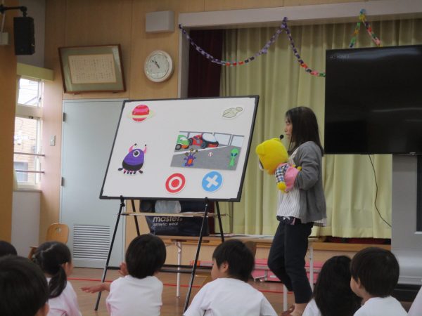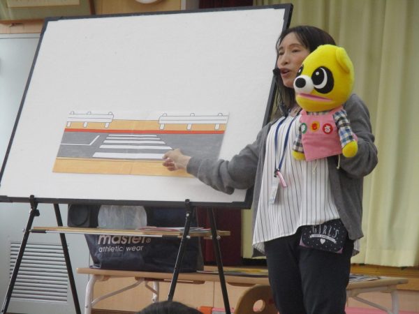パペット人形の ”まもるくん” と一緒に交通ルールを教えてもらったり、クイズに答えたりしながら楽しく学ぶことができました。