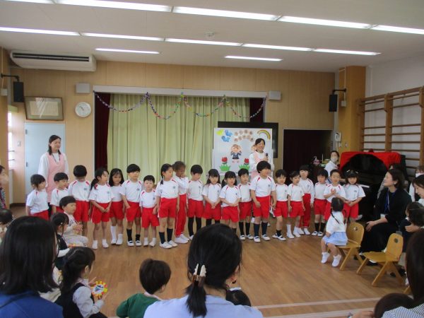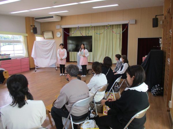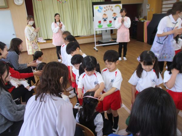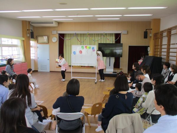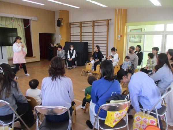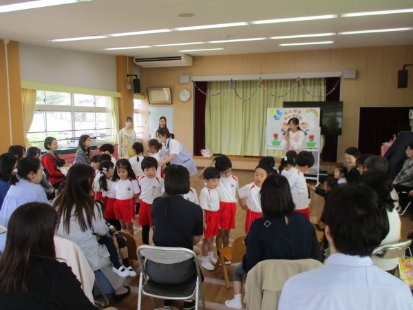少しドキドキしている子もいましたが、お名前を呼ぶと元気にお返事をしてくれたり、先生たちからのパネルシアターでは一緒に口ずさんでくれる姿も見られました。